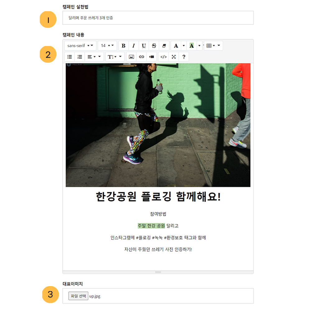 1. input form을 통해 캠페인 제안에 필요한 정보들(캠페인 제목, 실천법, 목표 포인트)을 사용자가 직접 입력할 수 있습니다.