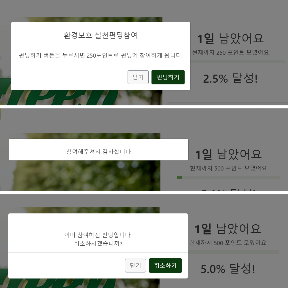 2. 펀딩할 시, ajax를 통해 사용자의 펀딩참여를 전송하고, 업데이트된 펀딩 데이터를 전달받아 화면에 보여줍니다.
